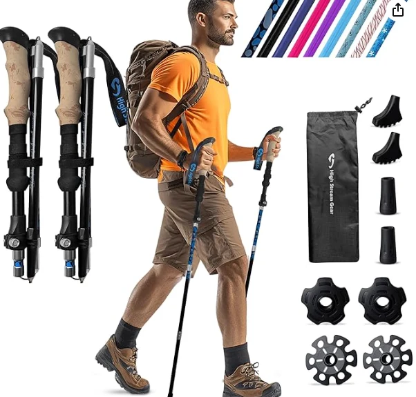 बॅकपॅकिंग, व्यायाम आणि प्रवासासाठी कोलाइसेबल नॉर्डिक हायकिंग पोल. फोल्ड करण्यायोग्य हायकिंग पोल, 2 अॅल्युमिनियम नॉर्डिक कोल्सिबल ट्रेकिंग पोलचा सेट