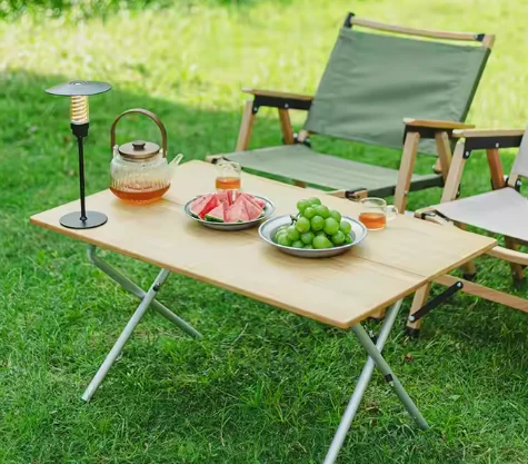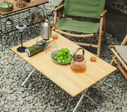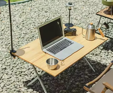फोल्डेबल पोर्टेबल बांबू आणि अॅल्युमिनियम टेबल, जे बळकट, बळकट आणि पर्यावरणास अनुकूल आहे. आणि प्रभावी वॉटरप्रूफ. गुळगुळीत टॅब्लेटॉप पेय, स्नॅक्स किंवा स्वयंपाक उपकरणे ठेवण्यासाठी योग्य आहे.