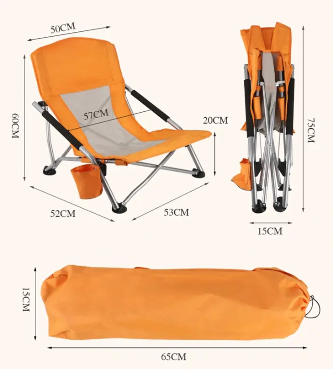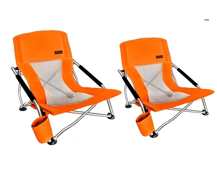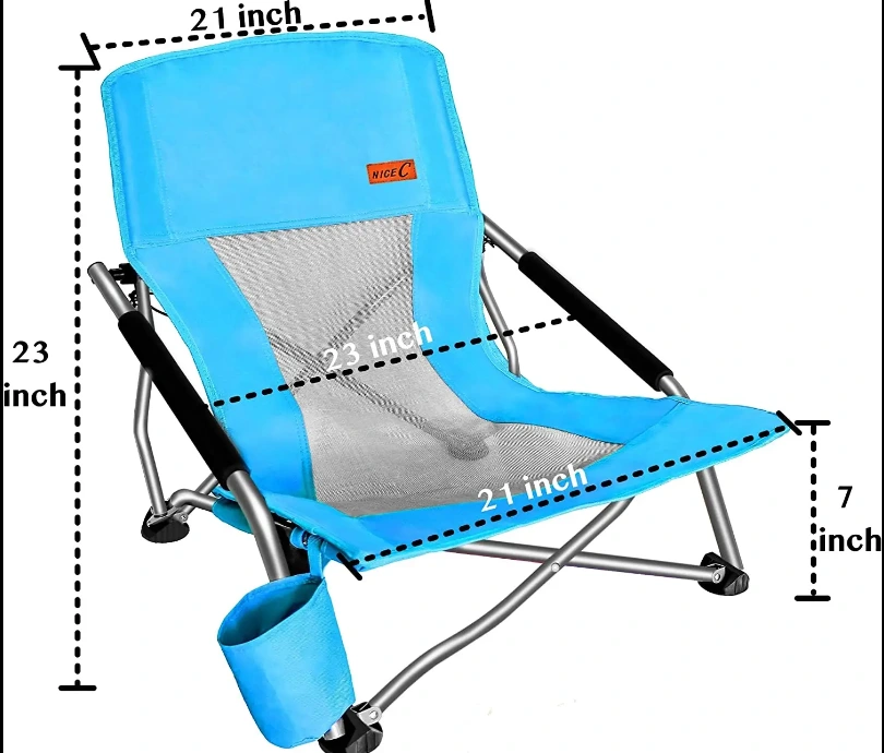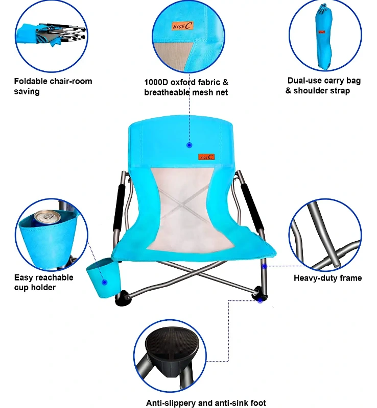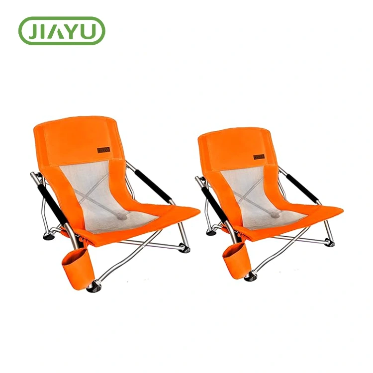 फोल्डिंग बीच सेट, कप धारक आणि कॅरी बॅगसह पोर्टेबल वाळू खुर्ची फोल्डिंग प्रौढांसाठी कमी बीच खुर्च्या. झेझियांग जिय्यू आउटडोअर प्रॉडक्ट्स कंपनी, लि., श्वास घेण्यायोग्य आणि कूलिंग जाळी फॅब्रिक जे आपण बसता तेव्हा हवा वाहू देते. धातूच्या हातांवर हाताच्या चकत्या आहेत जेणेकरून आपण आपले हात आरामात विश्रांती घेऊ शकता.