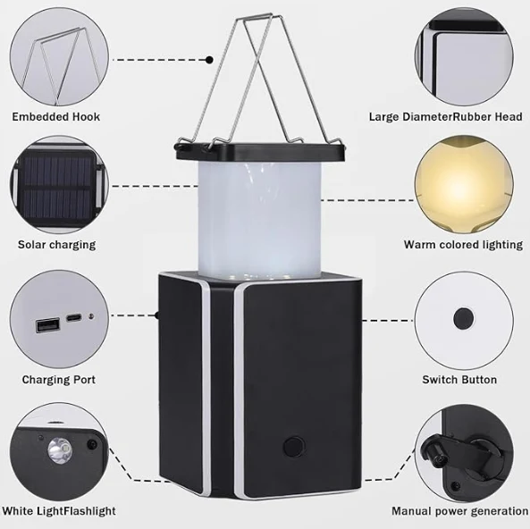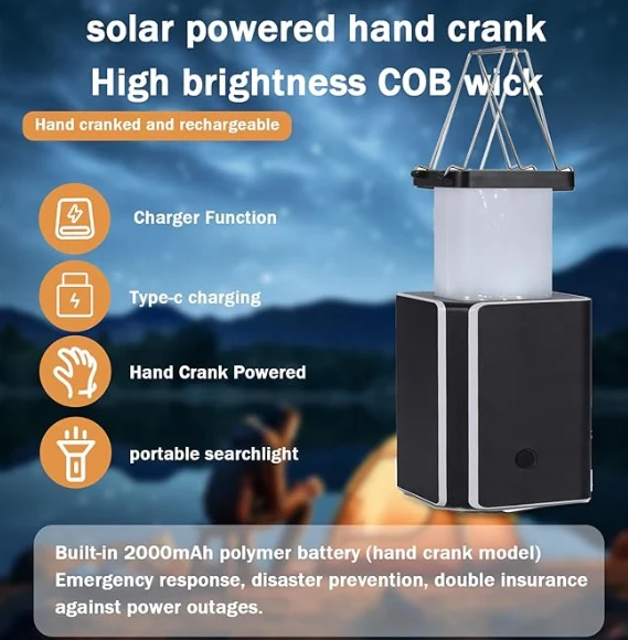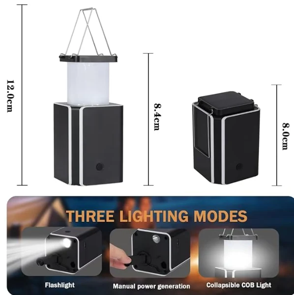 एलईडी सौर कॅम्पिंग लाइट, इमर्जन्सी कॅम्पिंग लँटर्न लाइट्स हँड-क्रॅंक पॉवर जनरेशन. जर आपल्याकडे आसपास चार्जर नसेल आणि सूर्य नसेल तर हा हात-क्रॅंक केलेला जनरेटर प्रकाश चार्ज करण्यासाठी योग्य आहे.
