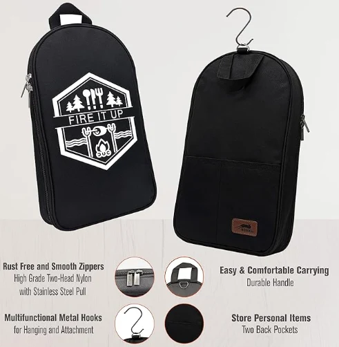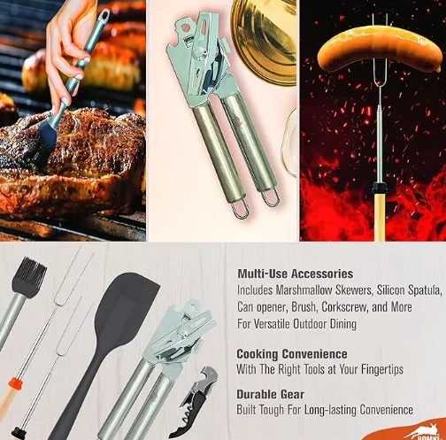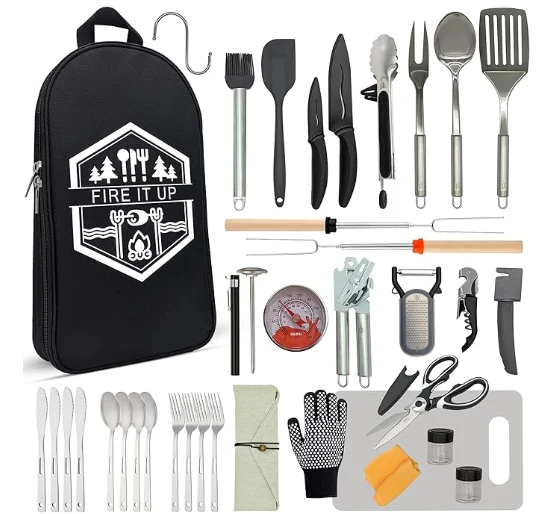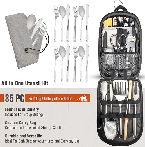 आउटडोअर कॅम्पिंग कुकवेअर स्टोरेज बॅग ही 35 पीसी कॅम्पिंग पाककला भांडी सेट आपल्या मैदानी स्वयंपाकाच्या गरजेसाठी एक संपूर्ण उपाय आहे. यात कॅम्पिंग किचन सेट आणि कॅम्पिंग भांडी स्वयंपाक सेट समाविष्ट आहे, सर्व सुबकपणे अतिरिक्त कंपार्टमेंट्स आणि दोन बॅक पॉकेट्ससह सानुकूल बॅगमध्ये पॅक केलेले आहे. सेट आपल्या सर्व कॅम्पिंग पाककला आवश्यकतेची पूर्तता करण्यासाठी डिझाइन केलेले आहे, जे आपल्या कॅम्पिंग गियरमध्ये एक अपरिहार्य व्यतिरिक्त आहे