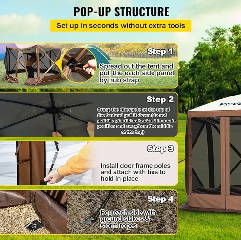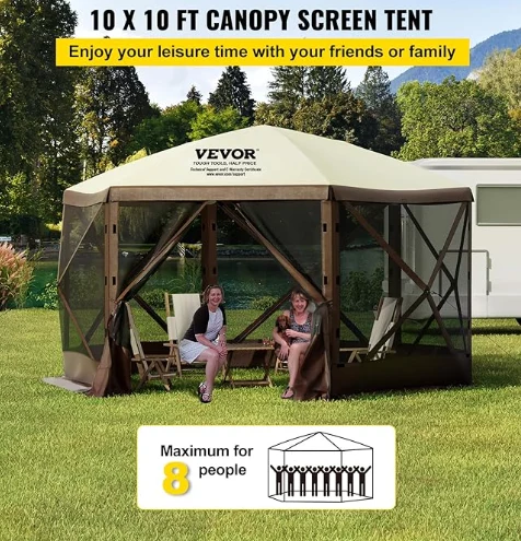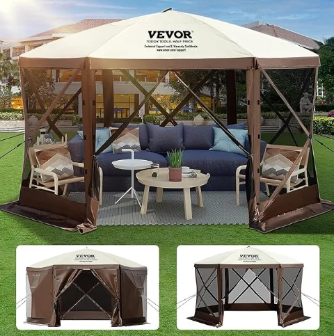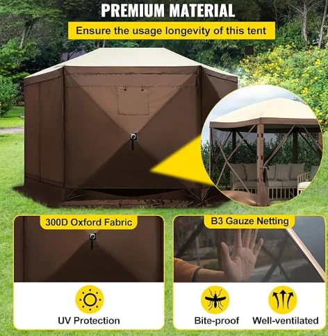 रेनप्रूफ पेर्गोला कॅम्पिंग कॅनॉपी तंबू, कॅम्पिंग गॅझेबो तंबू 300 डी ऑक्सफोर्ड फॅब्रिक आणि बी 3 गौझ नेटिंगने बनविला आहे. हे आयपीएक्स 3 वॉटरप्रूफ, बाइट-प्रूफ आणि यूव्ही-प्रूफ आहे. 12 'x 12' गॅझ्बो कॅनोपी मैदानी निवारा वापरासाठी एक मोठी जागा प्रदान करते.
