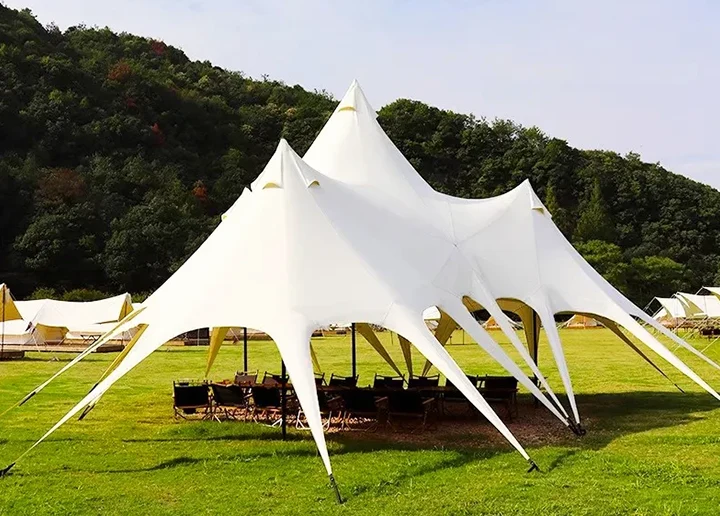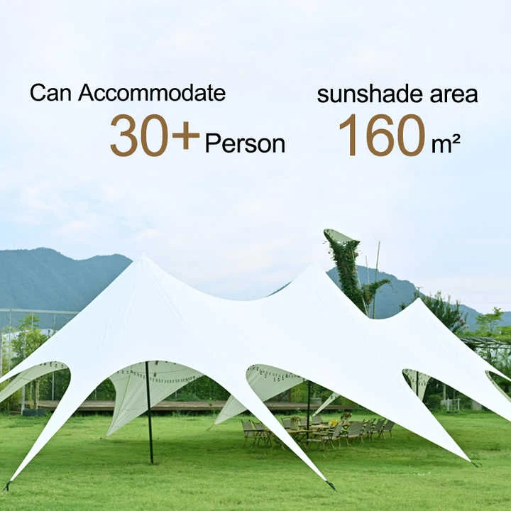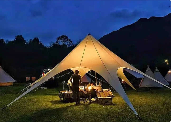 सनशेड वॉटरप्रूफ मोठ्या मैदानी तंबू पावसात घराबाहेर वेळ घालवण्यासाठी आरामात आणि बराच काळ टिकाऊ, कॅनव्हास तंबूंपेक्षा काळजी घेणे सोपे आहे.